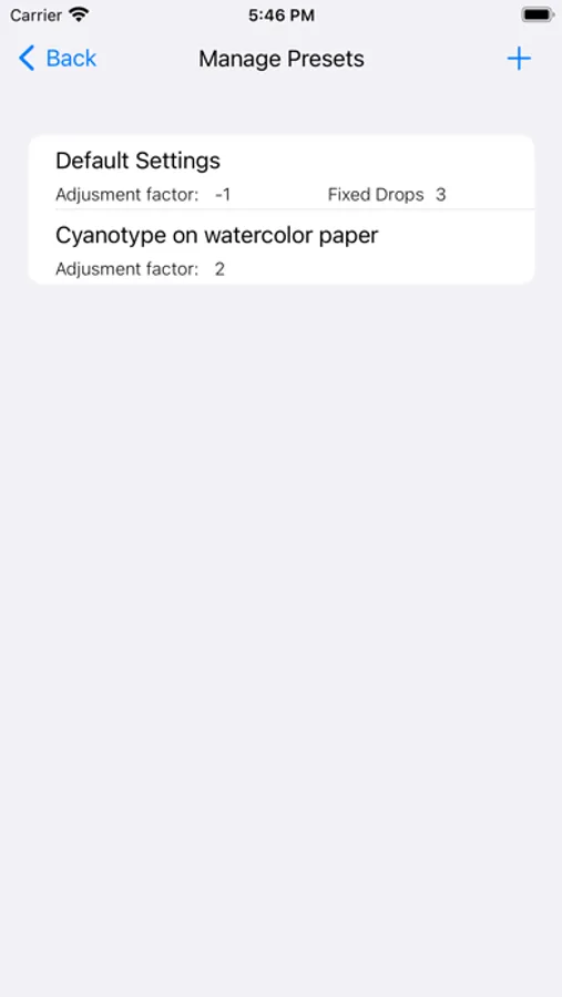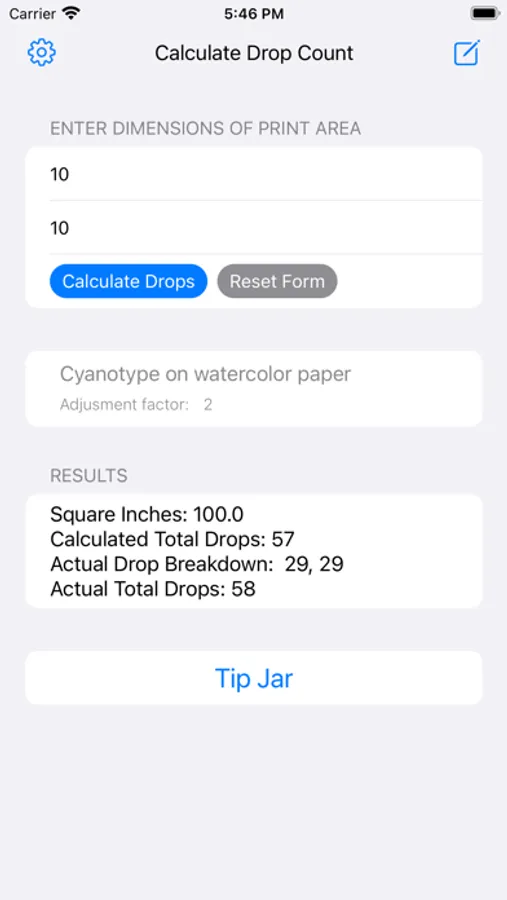 We understand that artists all tend to coat paper a little differently, and that drop counts will vary. In addition to different types of paper, the type of brush used varies substantially, with some artists even using a glass “puddle pusher”. We support these differences by allowing the artist to change an “adjustment factor”, which influences the drop count calculated by the app. If you find that you need MORE emulsion to cover a given area, adjust the slider towards the right, and for less emulsion, adjust it towards the left.
