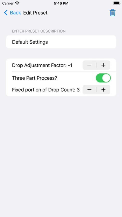 DropCalc allows the artist to customize the drop count, choose two or three part processes, create and save user presets, and choose between Metric or Imperial measurement systems.
