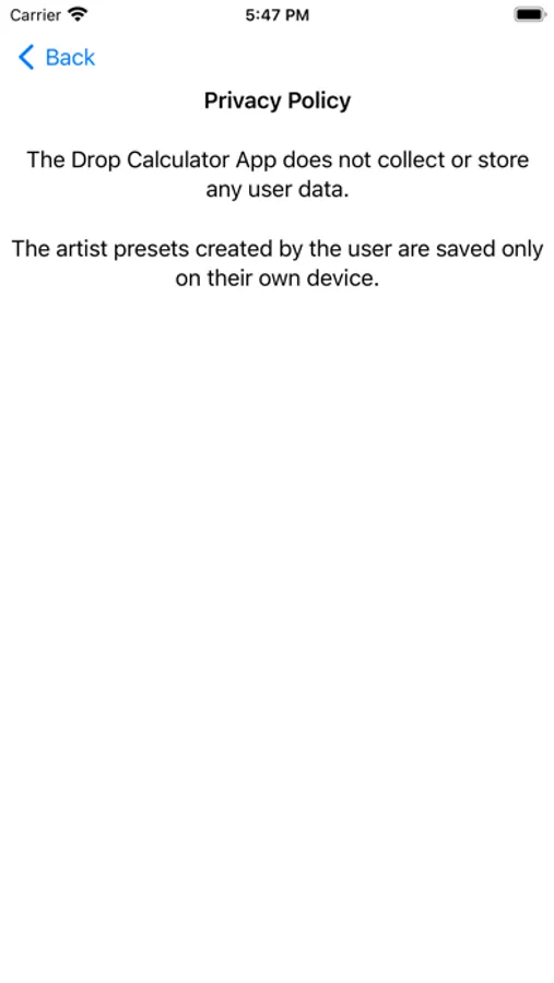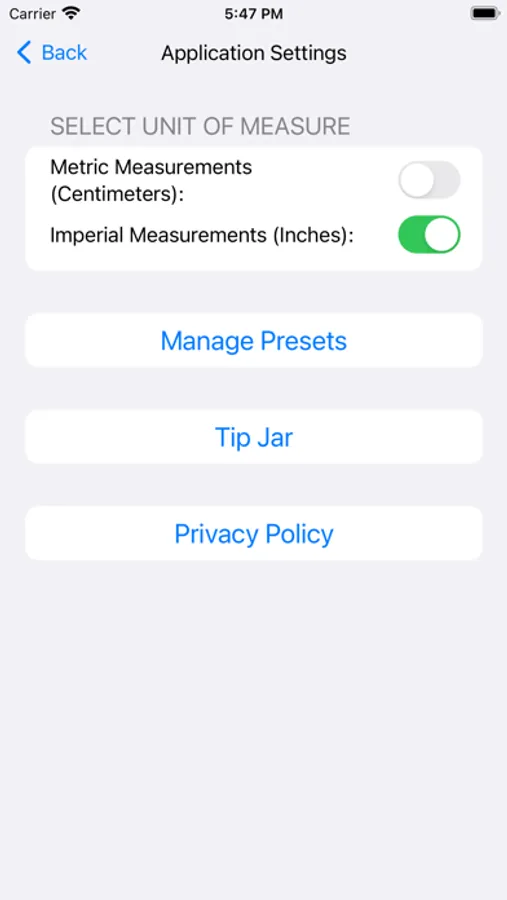 DropCalc allows the artist to work with a measurement system that is the most comfortable for them. The “settings” page allows the artist to select between Metric and Imperial (U.S.) measurement systems.