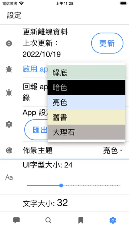 此 app 特色:隨機或自定顯示一則佛學辭定義、書籤功能、網址分享、離線瀏覽(初次啟動須連網)、佈景主題切換、字型調整、跨平台、無廣告、開放原始碼。