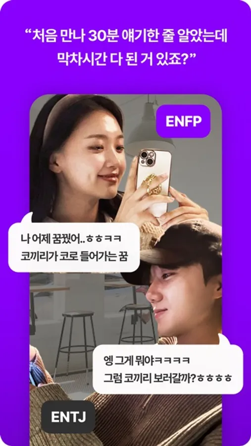 외모/스펙만 보는 다른 소개팅 앱과 달리, 성향까지 잘 맞는 상대와 데이트 할 수 있어요