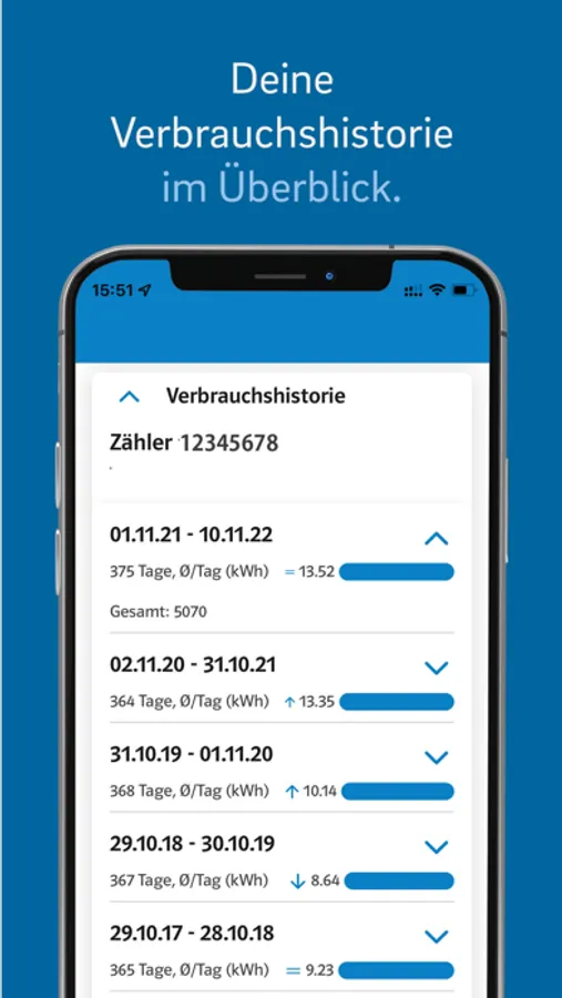 In Ihrer Verbrauchshistorie finden Sie alle Ihre Verbräuche, bis auf die freiwilligen Ablesungen (Zwischenablesungen), grafisch und tabellarisch aufgelistet.