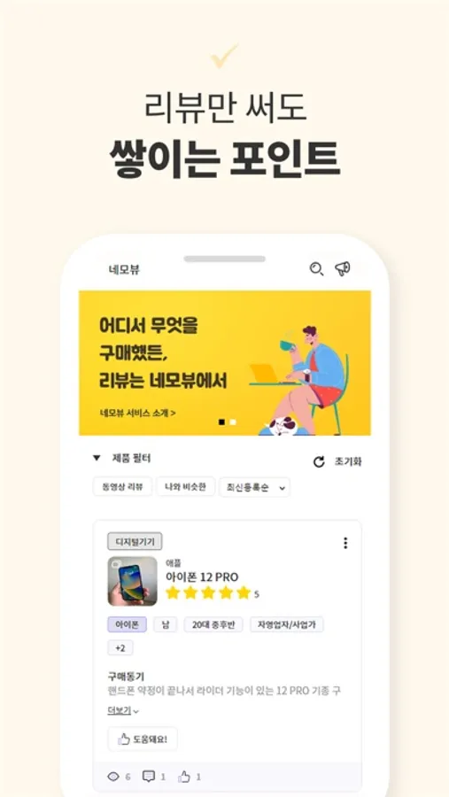 네모뷰에서는 나와 비슷한 환경의 사람들이 작성한 리뷰만 골라볼 수 있어요.
