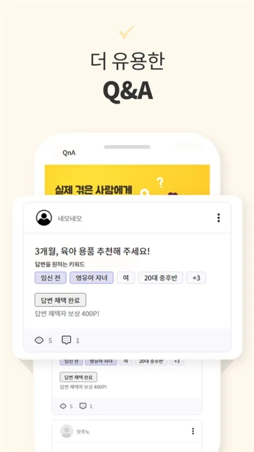 네모뷰에서는 질문을 등록할 때 ‘키워드 등록’ 기능을 통해 해당 키워드를 경험했던 사람만 답변을 달게 할 수 있어요. (채택 시, 추가 포인트 지급까지)