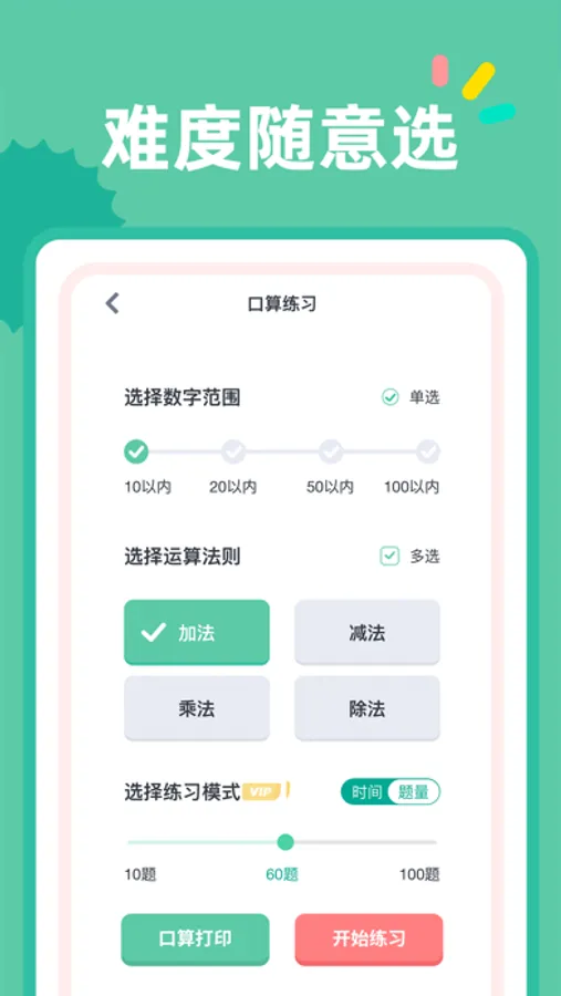 【口算练习】可以根据自己想要的数字范围和运算法则进行选择练习,精准训练自己的口算能力;