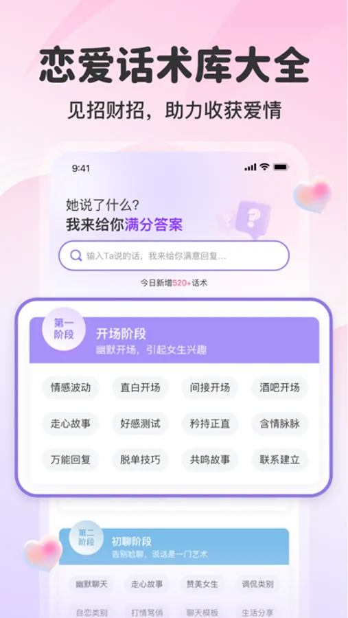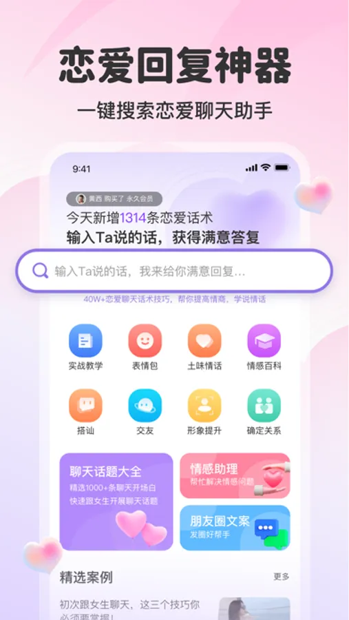 40w+恋爱话术:搜索对方的话,一键复制粘贴即可轻松追到对方,支持微信、QQ、陌陌、探探一键复制粘贴,快捷方便,堪称聊天回复神器。