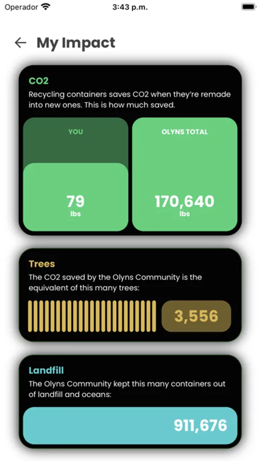 - See your lifetime eco-impact stats: # recycled containers, carbon (CO2) saved, and tree equivalents.