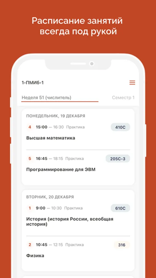 - Расписание – расписание на неделю и на семестр, учебные графики и мероприятия