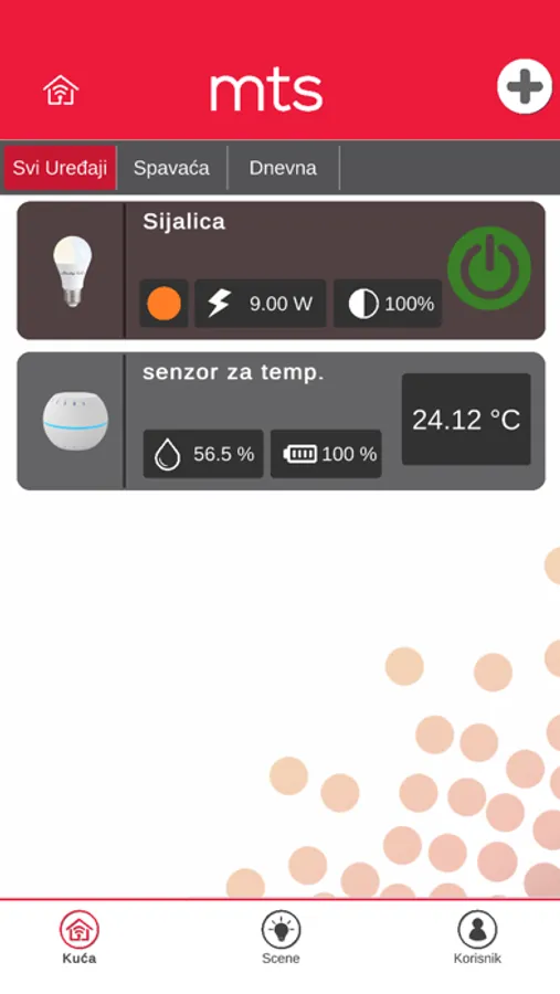 Mts Smart Home je aplikacija pomoću koje možete upravljati Smart Home sistemom, i sledećim uređajima: pametna utičnica, pametna sijalica, relej, senzor pokreta (vrata i prozora) i senzor temperature i vlažnosti vazduha.