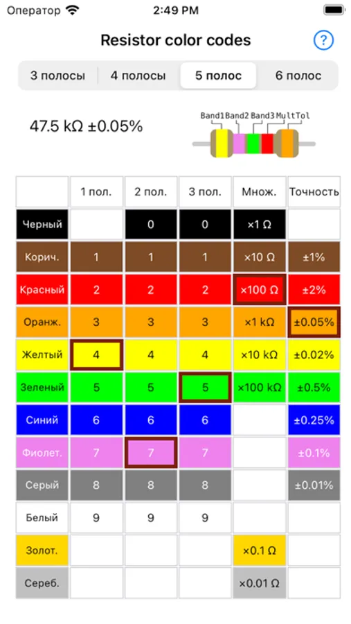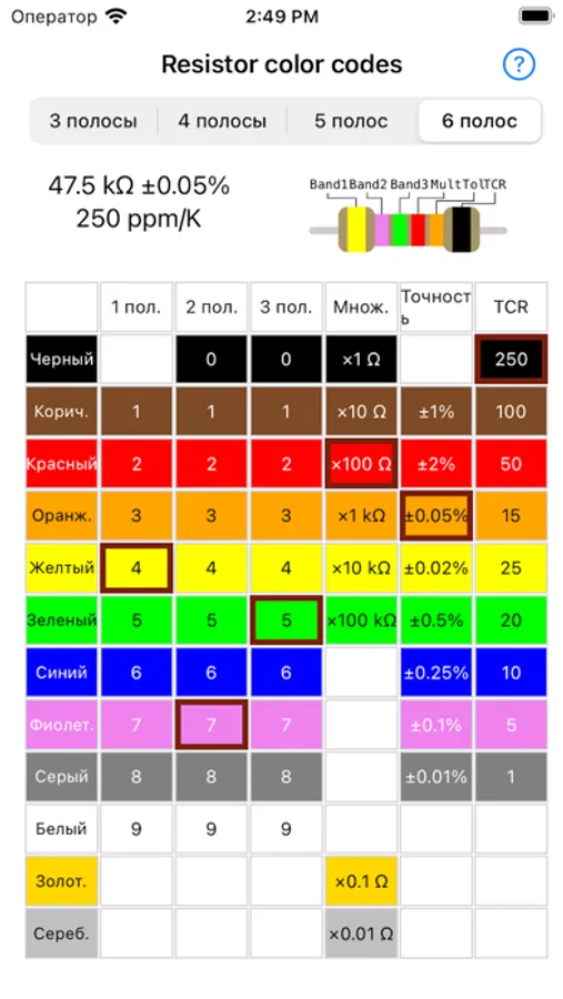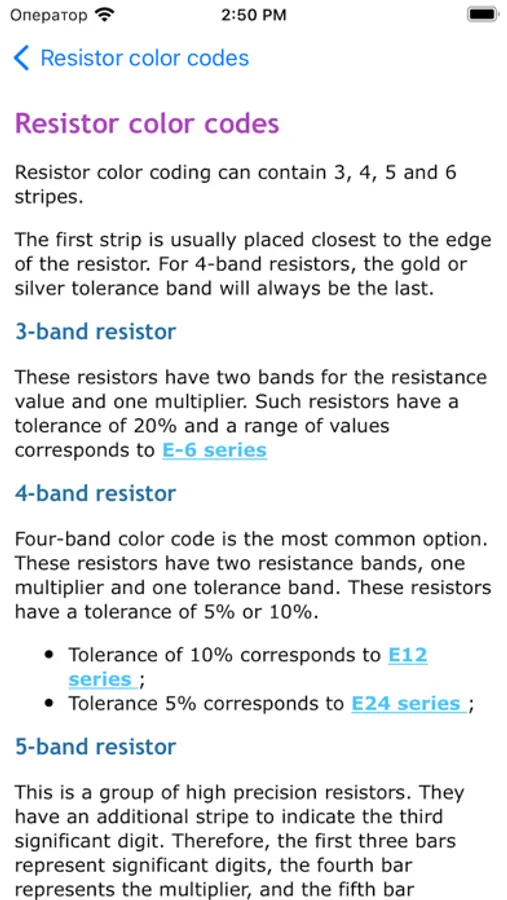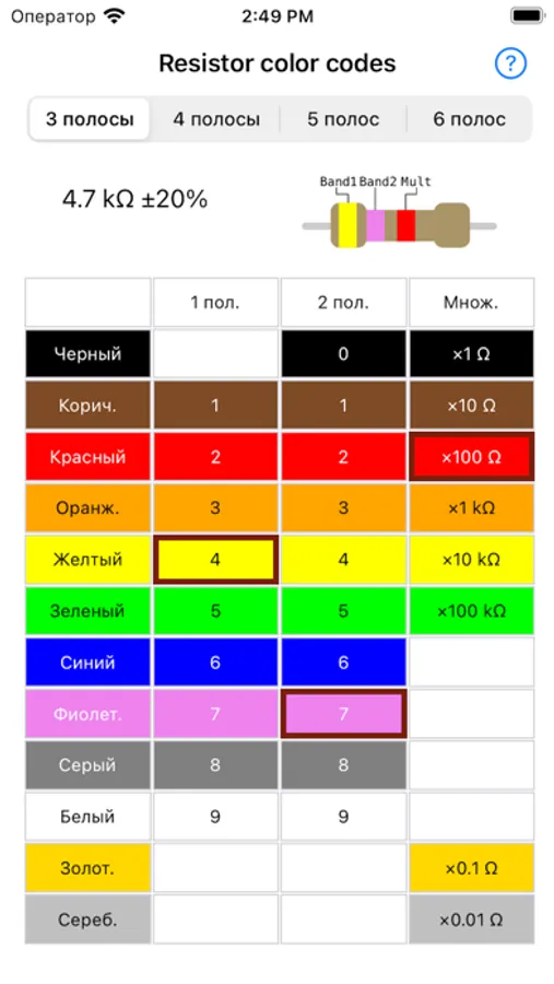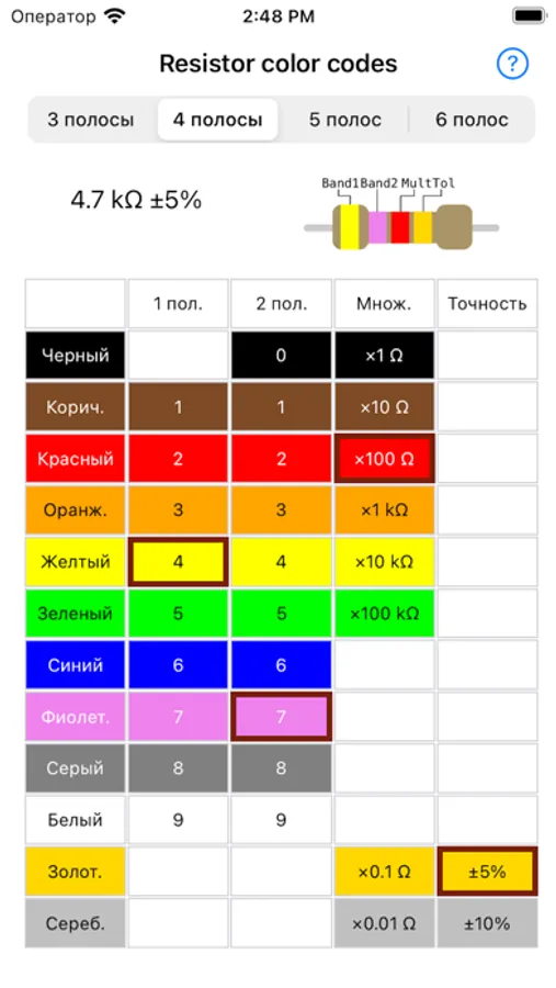 The application for calculating color codes for 3, 4, 5, 6-strips resistors. It checks the entered