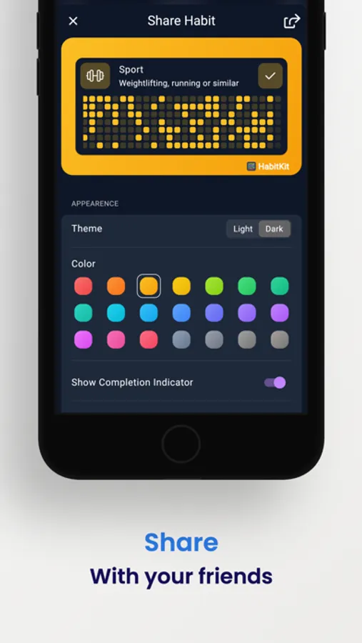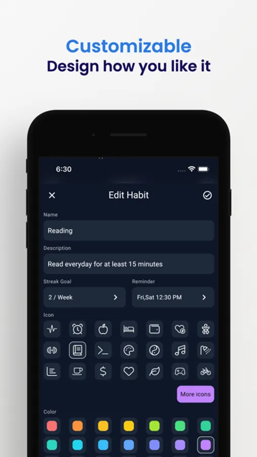 Add your habits you want to track in a fast and easy way. Provide a name, description, icon and color and you're good to go.