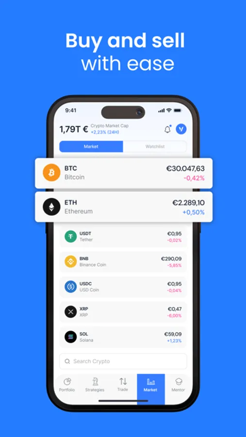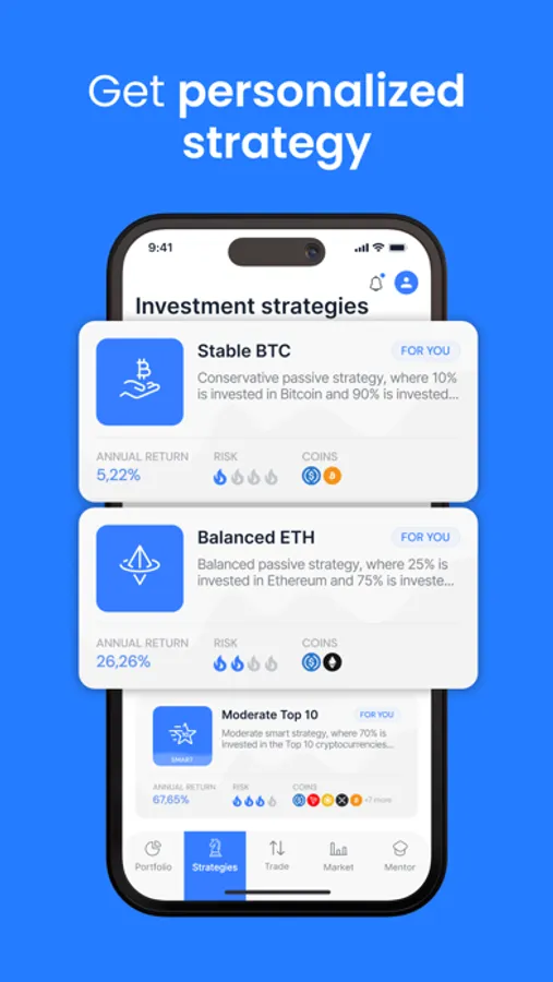 It is not easy to figure out which cryptocurrency to buy, what is a good entry price, and when is the right moment to sell. No need to worry, with Veli strategies, you can take advantage of long-term trends and invest like the smartest investors, automatically. All strategies have been developed and backtested for performance by a team of PhDs in quantitative finance. The goal is to buy in the bear market and sell in the bull run.