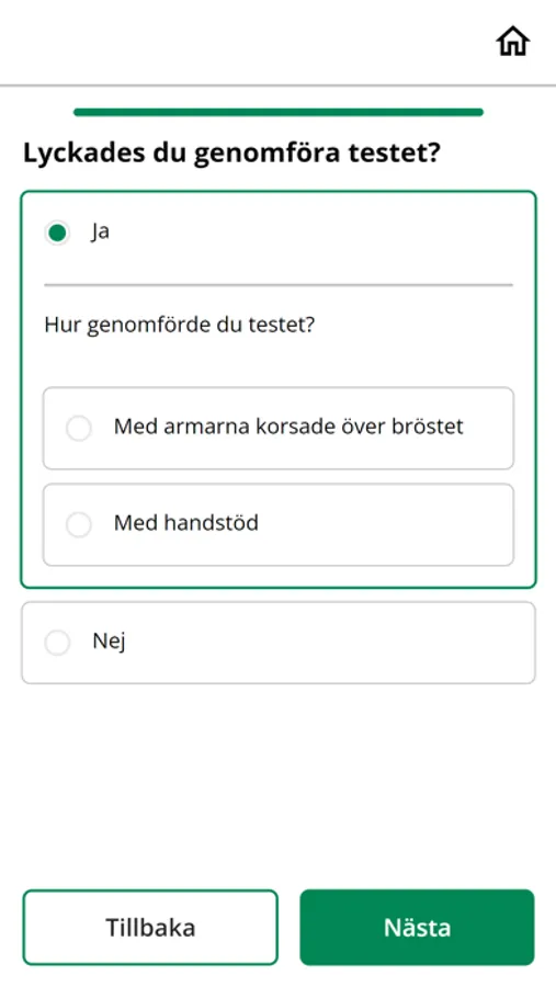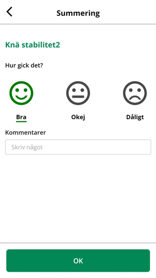 Varannan vecka ombeds du skatta din aktuella smärta samt genomföra test av din benstyrka (uppresning från stol). Resultatet delas med din fysioterapeut i syfte att anpassa din träning efter ditt aktuella behov. Efter varje genomfört träningspass kan du kommentera samt skatta hur du upplevde träningen.
