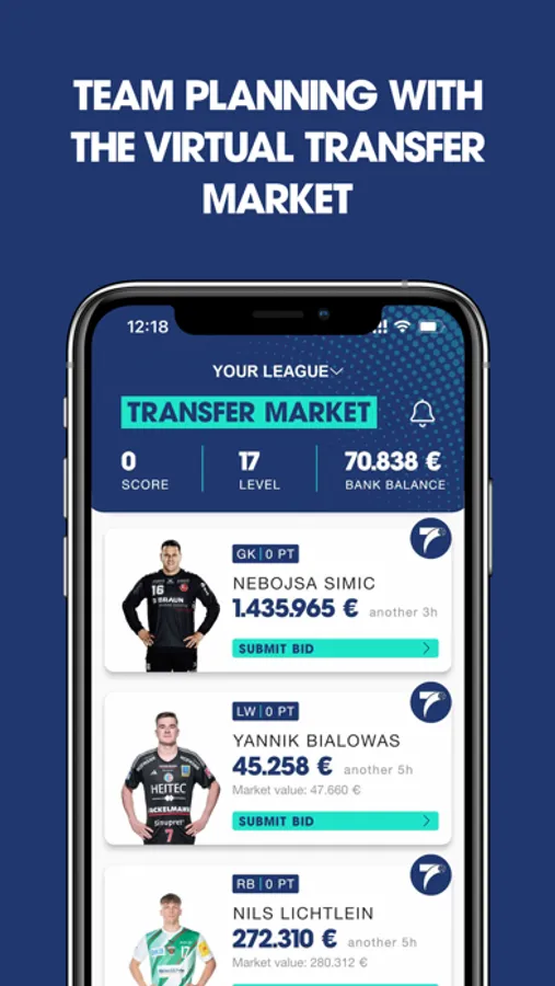 While you get a random team of 10 players and a fixed budget after joining a league, you can change your squad afterwards via the transfer market. Sell your players on the transfer market or bid on your handball stars, which are offered by other managers from your league or from START7.