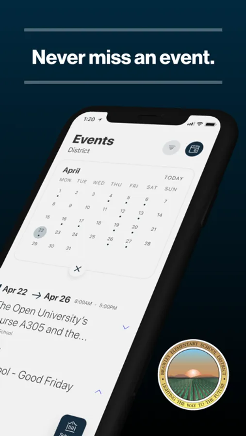 The event section shows a list of events throughout the district. Users can add an event to their calendar to share the event with friends and family with one tap.