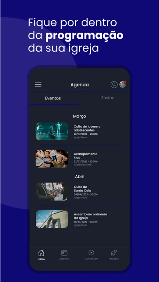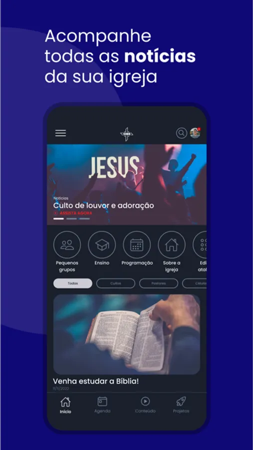 Recursos disponíveis no Aplicativo: Notícias, Agenda da igreja, Eventos, Conteúdos, Projetos, Transmissão ao Vivo e Módulo Ensino.