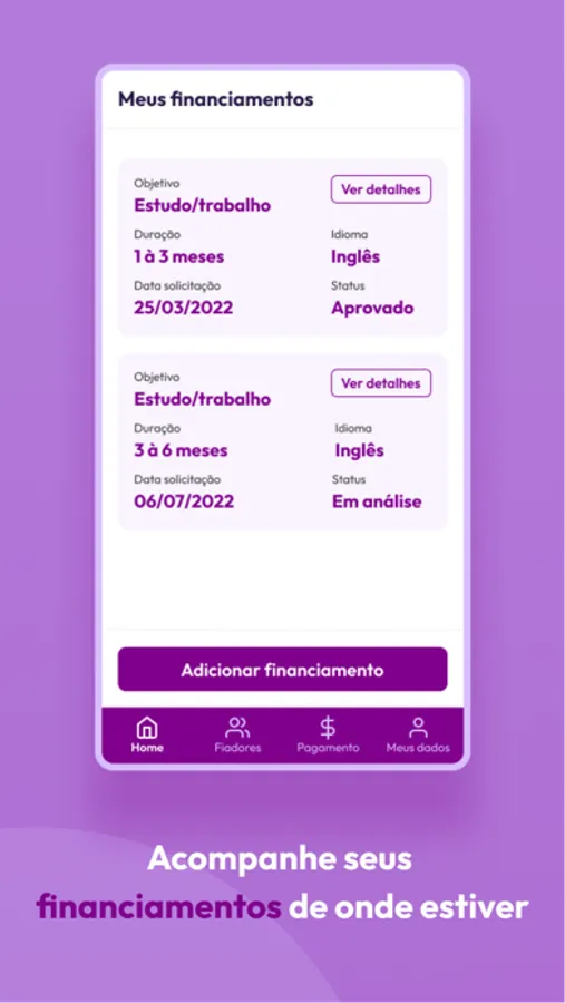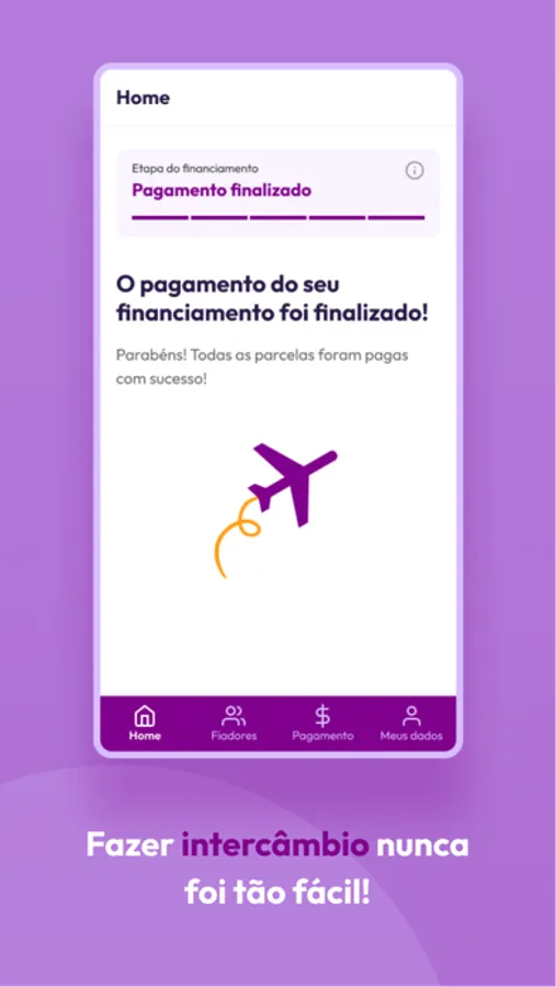 Dentro do aplicativo, você poderá consultar os contratos e os pagamentos do intercâmbio, além de poder baixar os boletos.