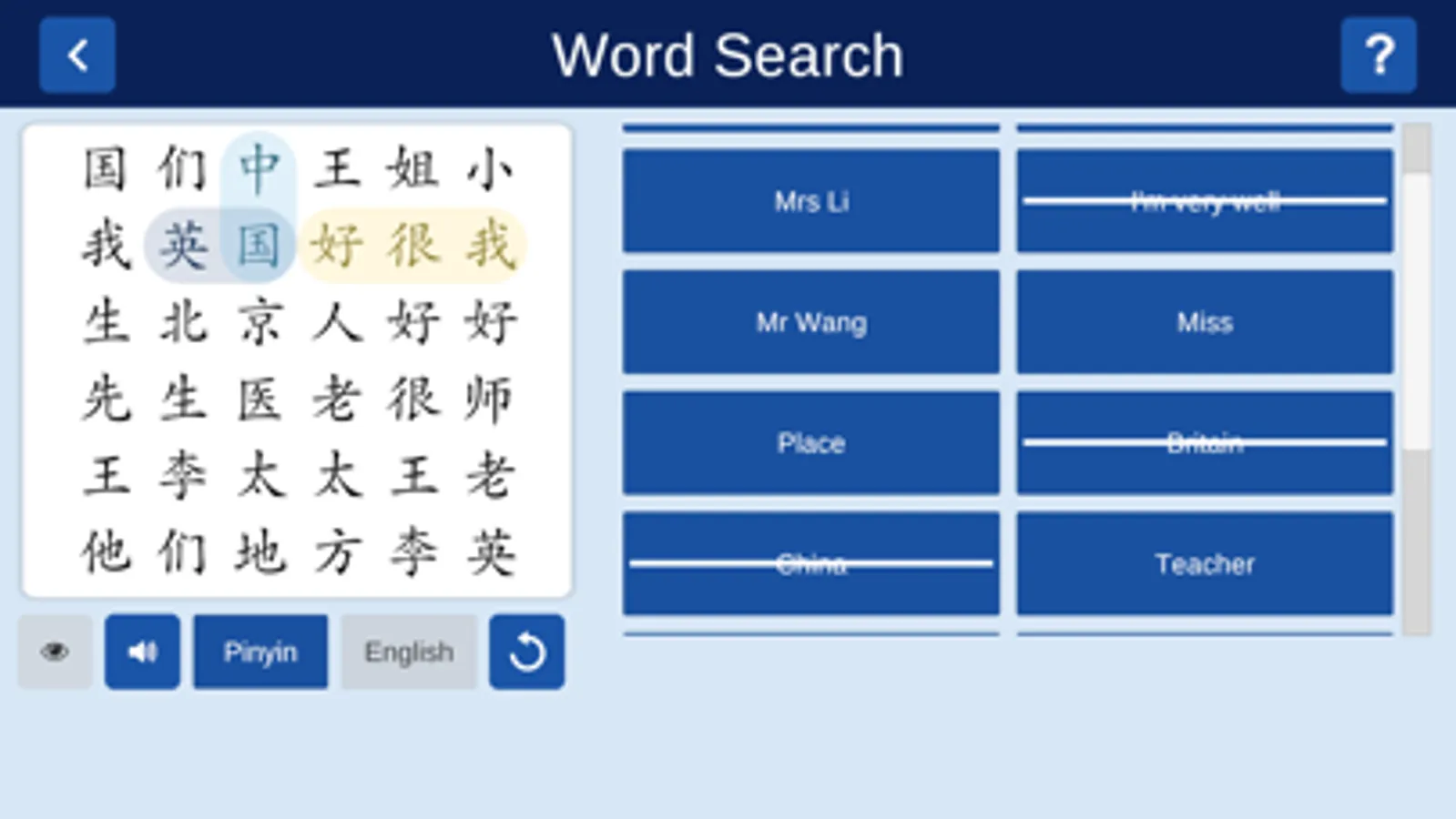 Word Search: Here you have the opportunity to search for words/phrases that consist of the characters you have learnt up till that point. This activity not only helps to develop your character recognition skills but also to remember characters in context, and it is fun to play!