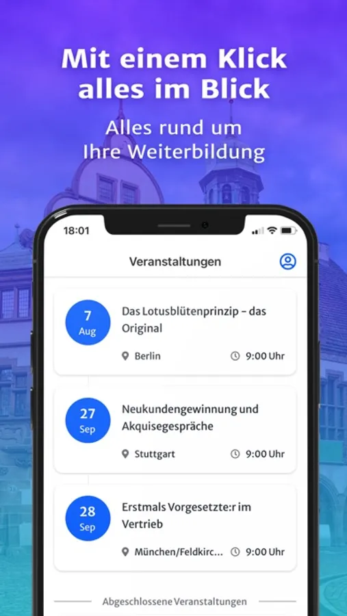 Finden Sie alle Informationen zu Ihrer Präsenz-Weiterbildungsveranstaltung übersichtlich und jederzeit zugreifbar in der Haufe Akademie for me App.