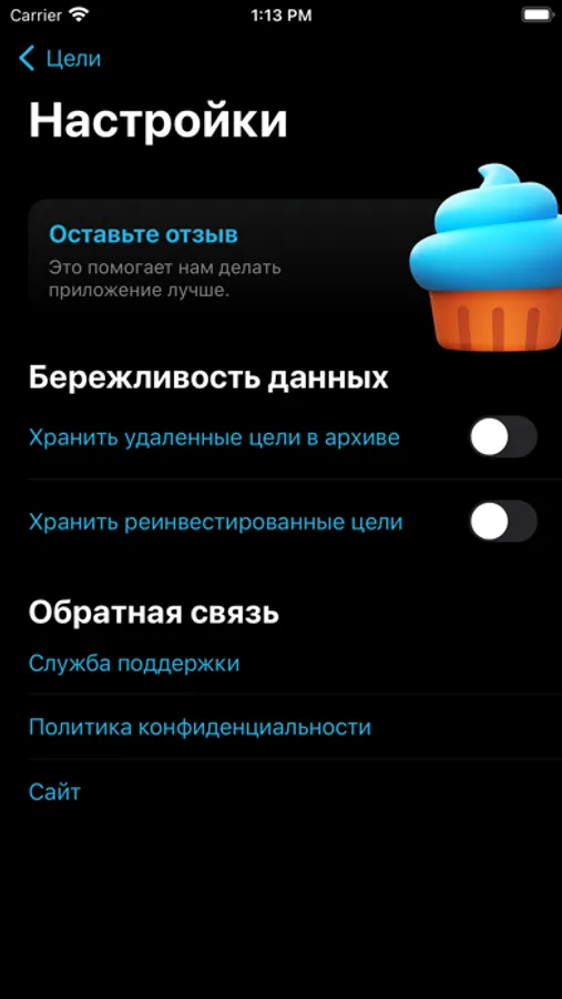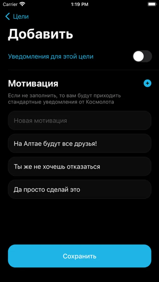 Добавив собственную мотивацию для вашей цели, вы будете получать не "обезличенную" мотивацию (о которой мы, все-таки, позаботились), но мотивацию которая важна конкретно вам. Каждый раз когда вам нужно будет отложить немного средств на свою цель, приложение напомнит вам, почему это для вас важно отправив уведомление. Мотивация, как и все остальные данные в приложении хранится только у вас на телефоне, а значит остается конфиденциальна.
