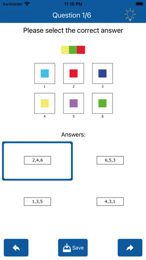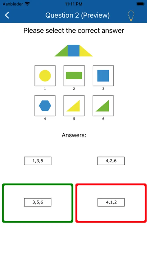 You will be given 4 choices from which to select. You can always use the bulb button (upper-right) to see a hint. The correct answers along with calculated score are proved upon completing the test.