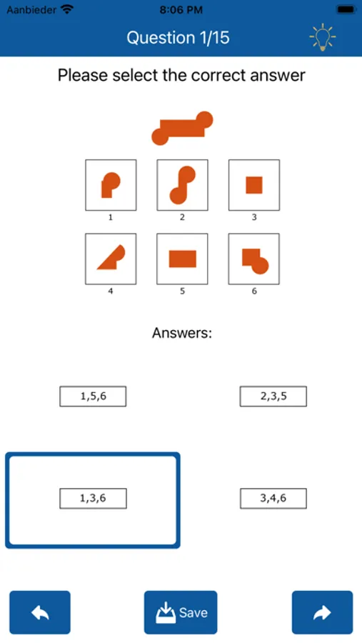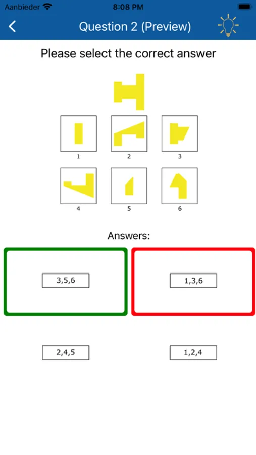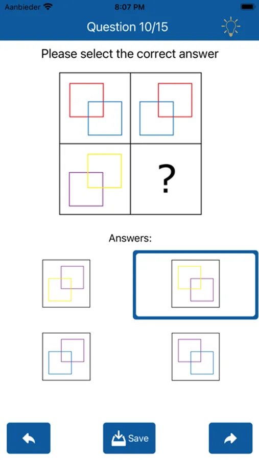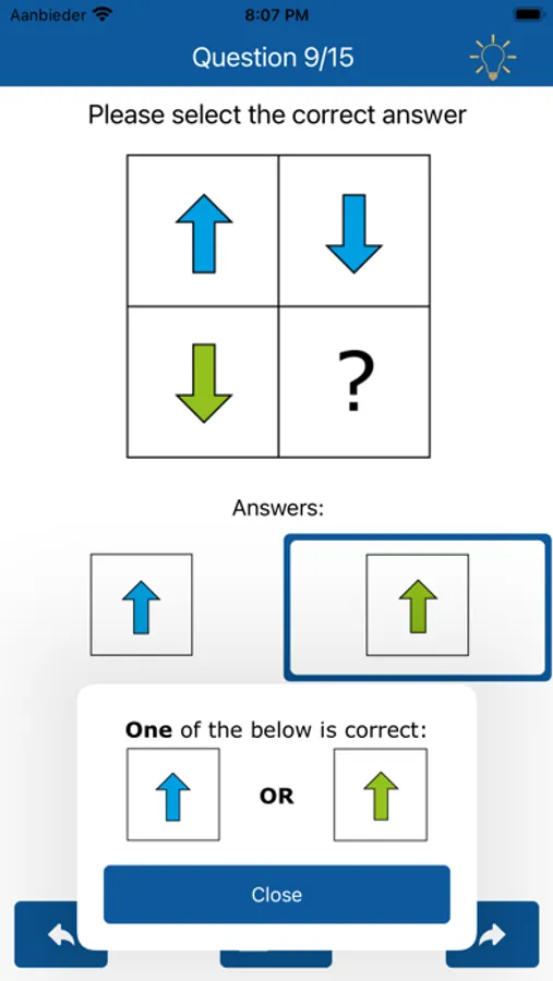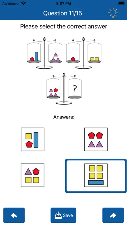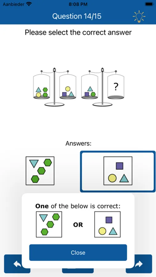 You will be given 4 choices from which to select. You can always use the bulb button (upper-right) to see a hint. The correct answers along with calculated score are proved upon completing the test.