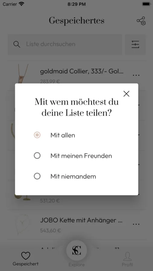 In order to generate our community we ask the user to register when configuring jewellery preferences for the first time. This implies a login screen once the user logged out.