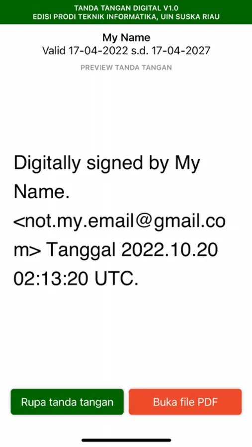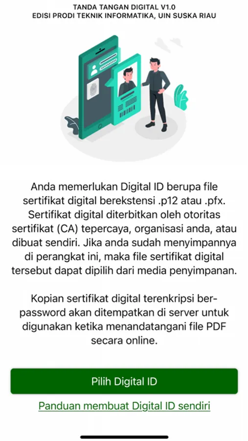 Aplikasi Tanda Tangan Digital (ttd!) Suska diperuntukkan bagi Pegawai dan Dosen di Program Studi Teknik Informatika, UIN Suska Riau. Anda dapat menggunakan aplikasi untuk menandatangani (secara digital) suatu file PDF. Aplikasi ini tidak menyediakan pembuatan sertifikat digital. Sertifikat digital dapat diperoleh dari otoritas sertifikat tepercaya, dibuat oleh organisasi anda, atau dibuat sendiri. File PDF yang telah ditandatangani dapat disimpan atau dibagikan ke aplikasi lain.