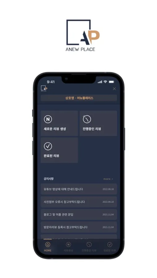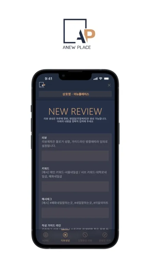 어뉴플레이스는 '광고주용 리뷰 콘텐츠 관리 앱' 입니다. 리뷰 작성을 요청하고 진행과정을 확인할 수 있습니다.