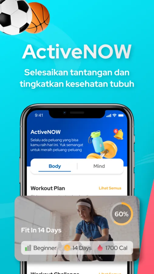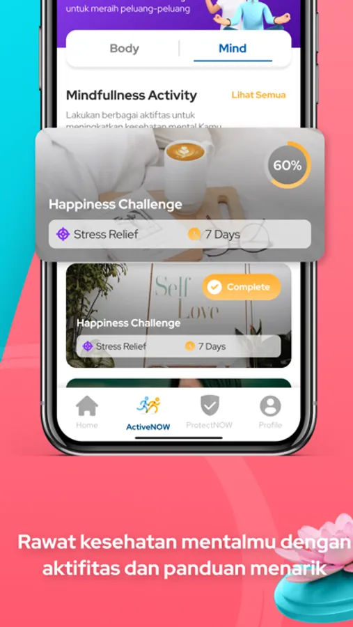 Yuk jaga kondisi tubuh dan jiwamu NOW! Ada fitur “body” dengan berbagai plan dan challenge untuk kamu lakukan berkala dan fitur “mind” dengan berbagai activity dan guidance untuk menjaga kesehatan mentalmu.