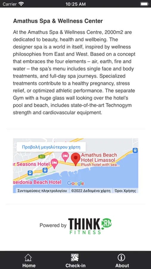 At the Amathus Spa & Wellness Centre, 2000m2 are dedicated to beauty, health and wellbeing. The designer spa is a world in itself, inspired by wellness philosophies from East and West. Based on a concept that embraces the four elements – air, earth, fire and water – the spa’s menu includes single face and body treatments, and full-day spa journeys. Specialized treatments contribute to a healthy pregnancy, stress relief, or optimized athletic performance. The separate Gym with a huge glass wall looking over the hotel’s pool and beach, includes state-of-the-art Technogym strength and cardiovascular equipment.