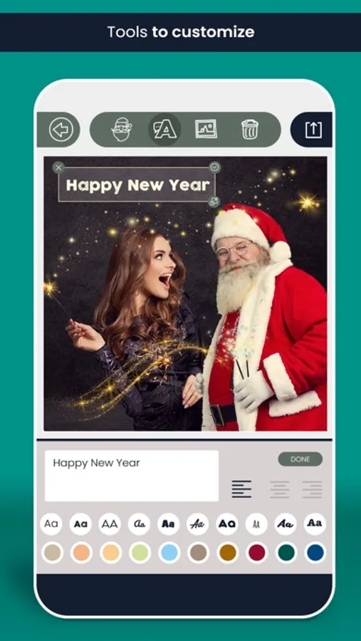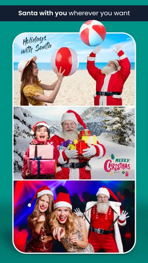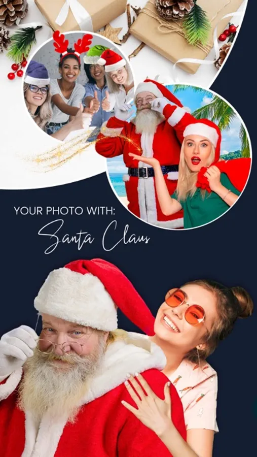 Save the image to share it with your family or friends via social networks. Share your selfies directly from the app as a greeting card or Christmas messages on social media. One click is all it takes to get a Santa Claus sticker on your photo.