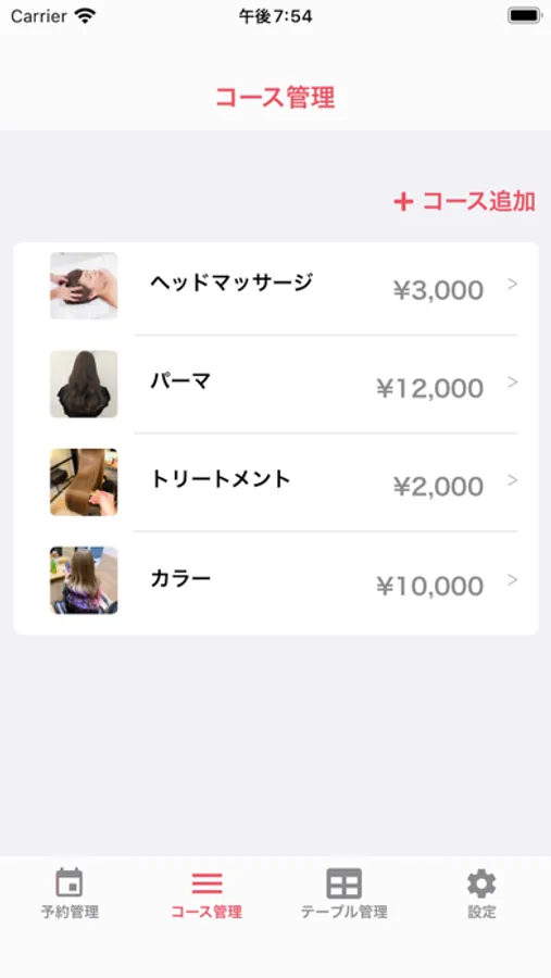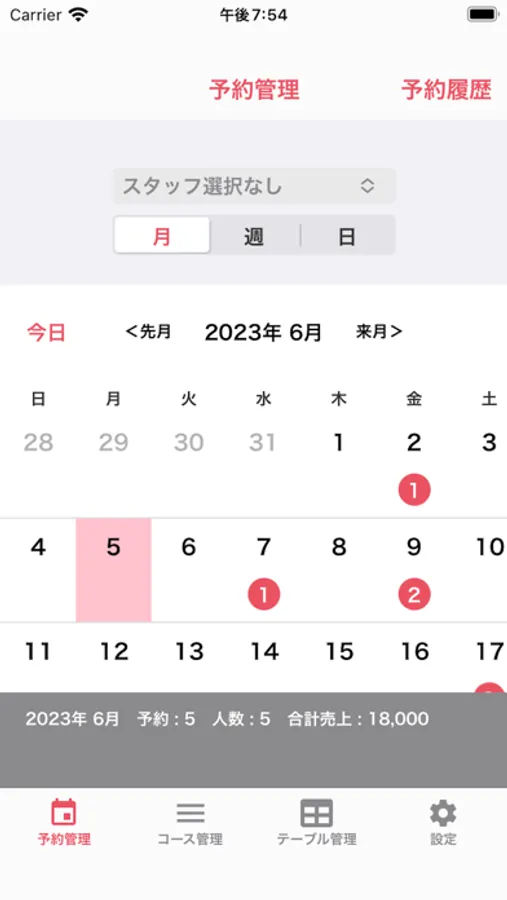 カレンダーで予約を確認でき、店舗のコース、テーブル、顧客の管理を行います。