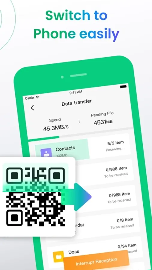 - Transfer via QR code scanning, hotspot and Wi-Fi connection