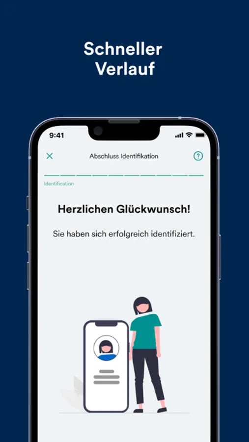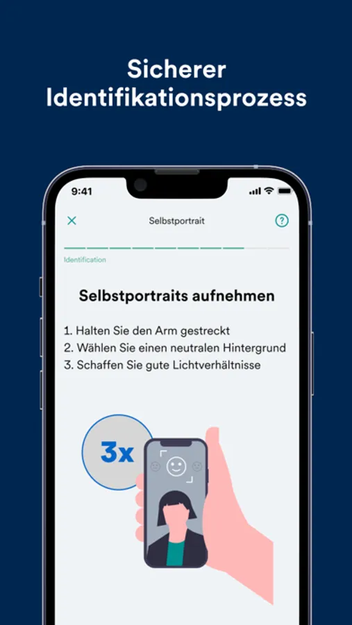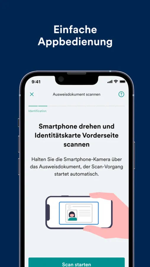 Die App führt Sie durch die Verifikation Ihres Ausweisdokuments und den Abgleich des Dokuments mit Ihren biometrischen Merkmalen. Die biometrische Identifikation per Gesichtsaufnahme wird mit einem Selfie durchgeführt.