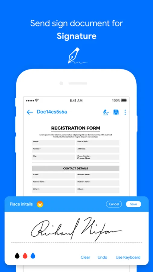 Sign Now is e-Signature app to used edit pdf and signatures. "Document Signer" is a mobile app for docusign e-signing PDF documents and other formats by one or multiple signers in sign easy. Then e-sign and send. No printing or faxing is needed.