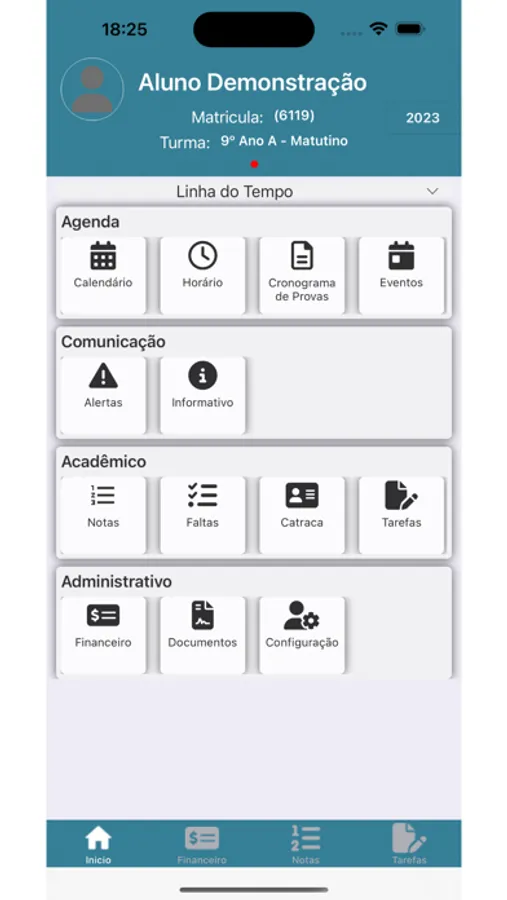 Comunicados, Notícias, Eventos, Calendário Escolar, Financeiro com emissão de Boletos, Notas, Frequência, Ocorrências, Tarefas, Conteúdos, Área exclusiva para publicações do Professor, além de uma Linha de Tempo que mostra os próximos eventos são funções encontradas neste aplicativo.