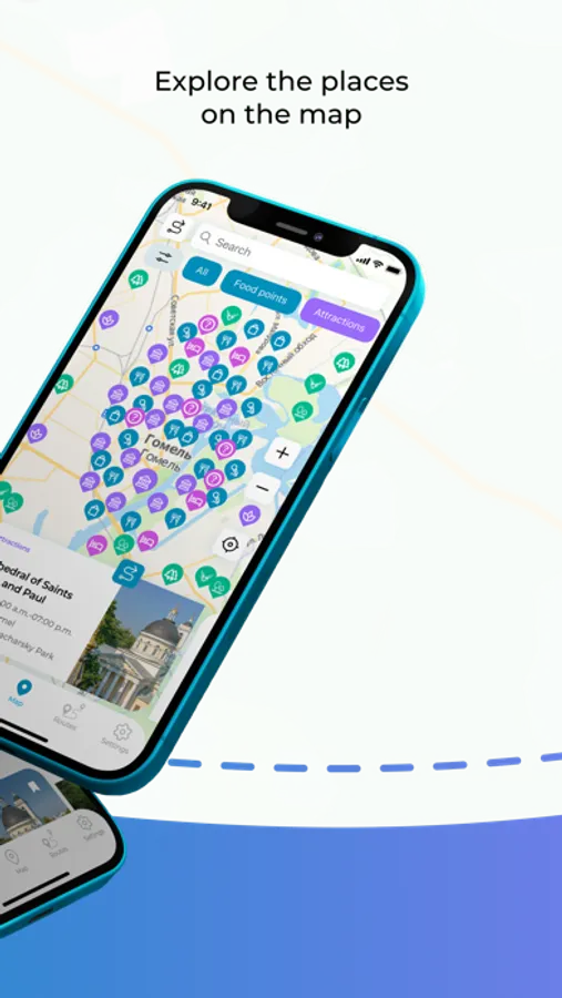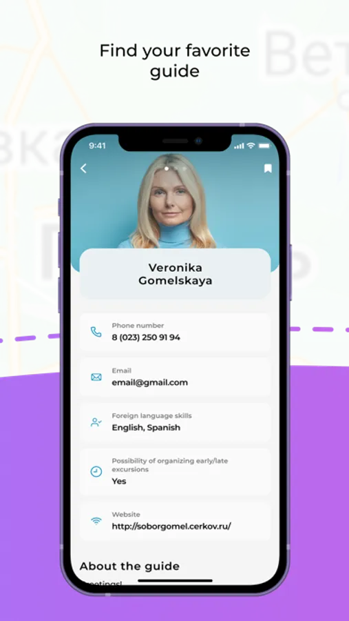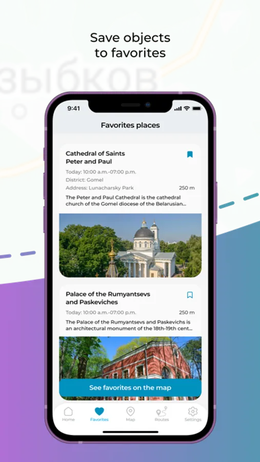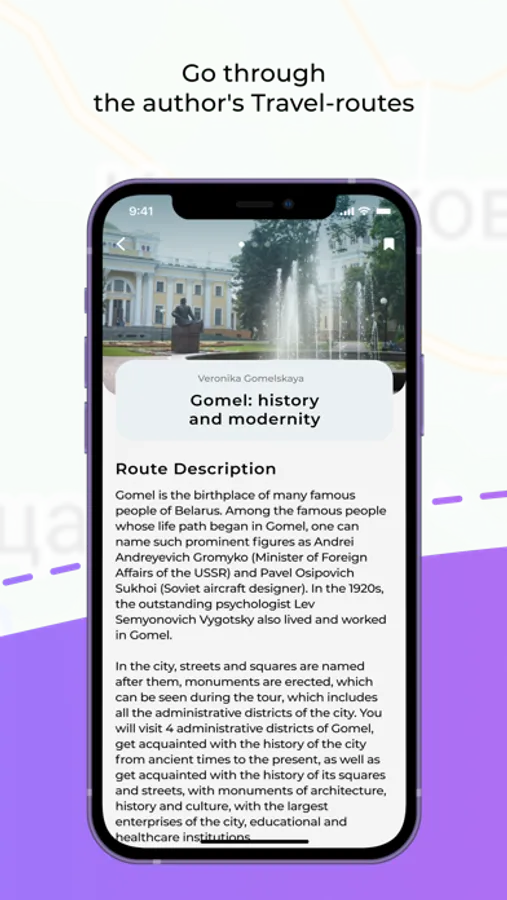 In the application, you will be able to pave the way between the objects you like, find a personal guide who has passed moderation and will provide you with a quality walk around the city, as well as get acquainted with his author's routes.