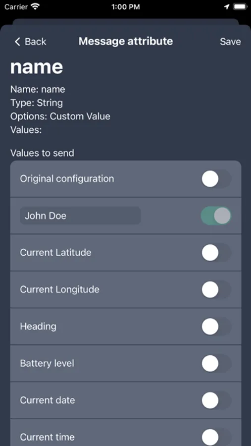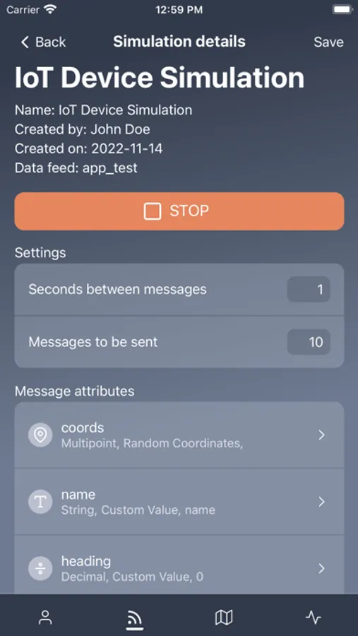 - Configure simulation message attributes to send the current user location, heading, or simply a fixed value saved on the device