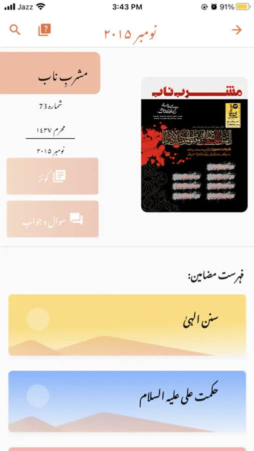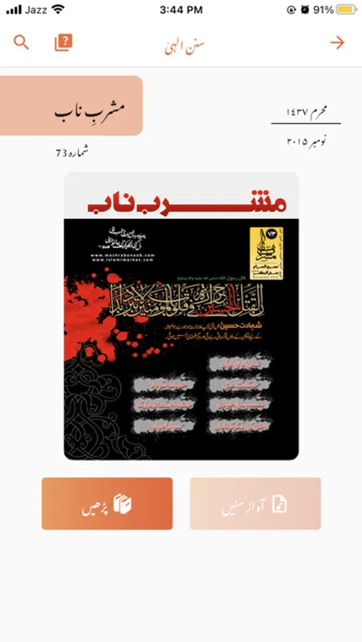 Mashrab e Naab(مشربِ ناب) is a monthly Islamic magazine published by Matab Publications. It includes magazines on the topics of true religion in the light of the Holy Quran.We know that, to stay in touch with Islam we have to practice it in our daily lives. Mashrabenaab covers Islamic aspects of our lives and our roles in the society we are living in. This magazine contains the pure ideology of Islam in true meanings, analysis of current affairs in our society and around the world in words of the great Islamic scholar Allama Syed Jawad Naqvi(آغا سید جواد نقوی). He teaches the philosophy of religion, Ahkaam, Ibaadat, Mehdviyat & many more aspects of Islam. Mashrab e Naab is published from Jamia Urwa tul Wusqa Lahore for the people who eager to get true knowledge of pure teachings of Islam.The word "مشرب ناب" means a source of pure water. This magazine explains by its name that it contains pure & true knowledge and magnificent teachings of Islam.