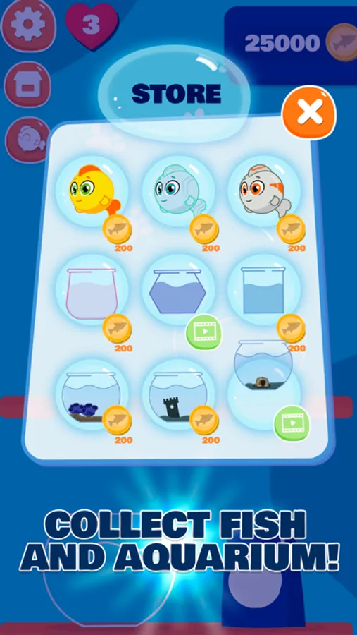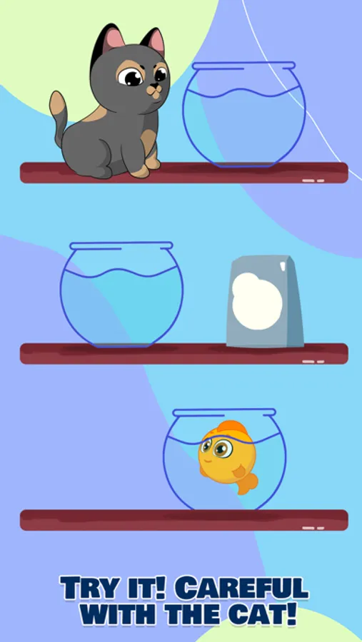 Simple Controls, play challenging and fun levels, 10+ colorful fishes to unlock! Different types of fish tanks! Power Ups!