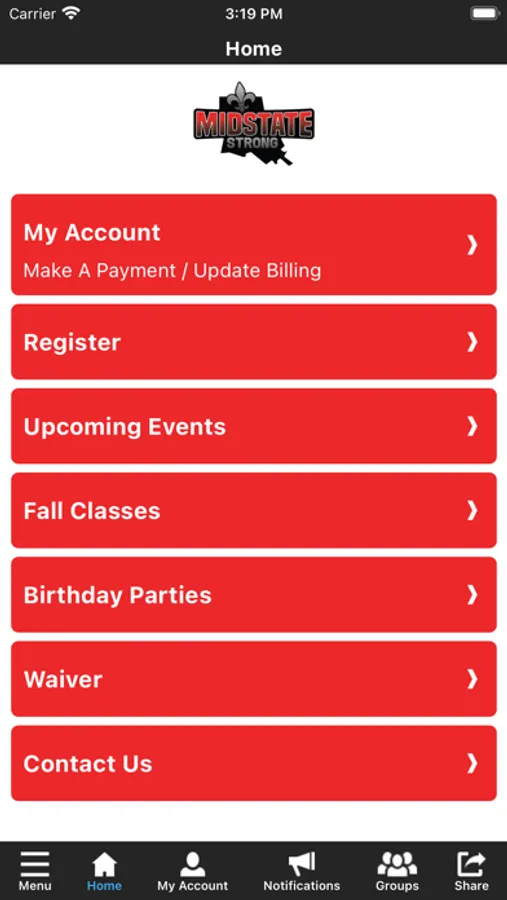 The Midstate app allows you to manage your account with ease, register for classes, parties, and special events. You'll also receive important notifications about class changes, closings, registration openings, special announcements, and upcoming events.