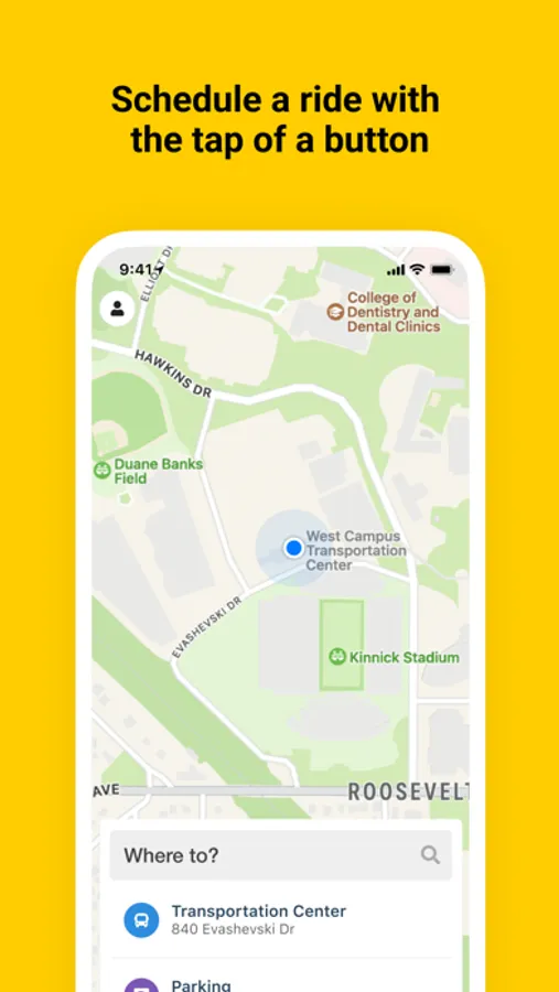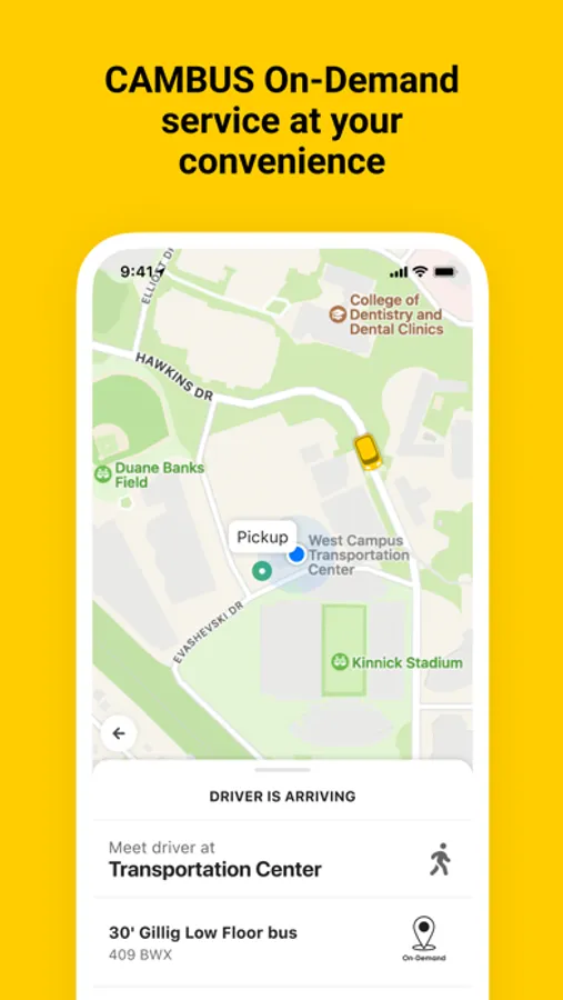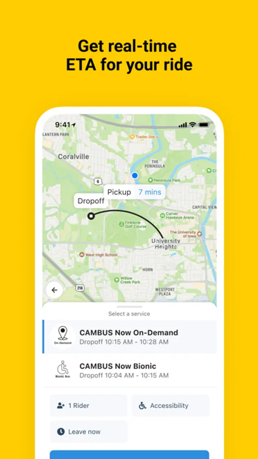 The CAMBUS Now app allows riders to schedule on-demand rides on the University of Iowa campus. The app features ride scheduling, live ETA’s, and notifications about your trip.