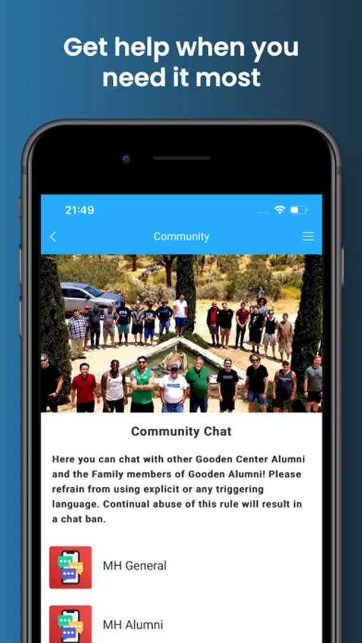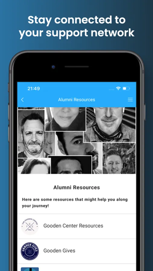 The target audience is alumni from The Gooden Center Treatment Center. The purpose of this app is to connect our recent patients to a vast network of alumni and offer additional resources in their sobriety/mental health journey. The app features, Mental Health Questionnaires, chat, videos, and additional resources for our alumni.