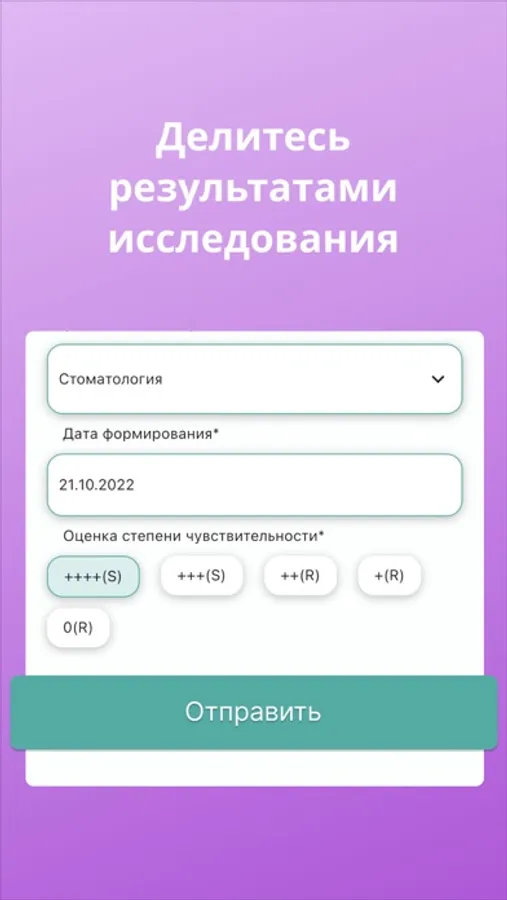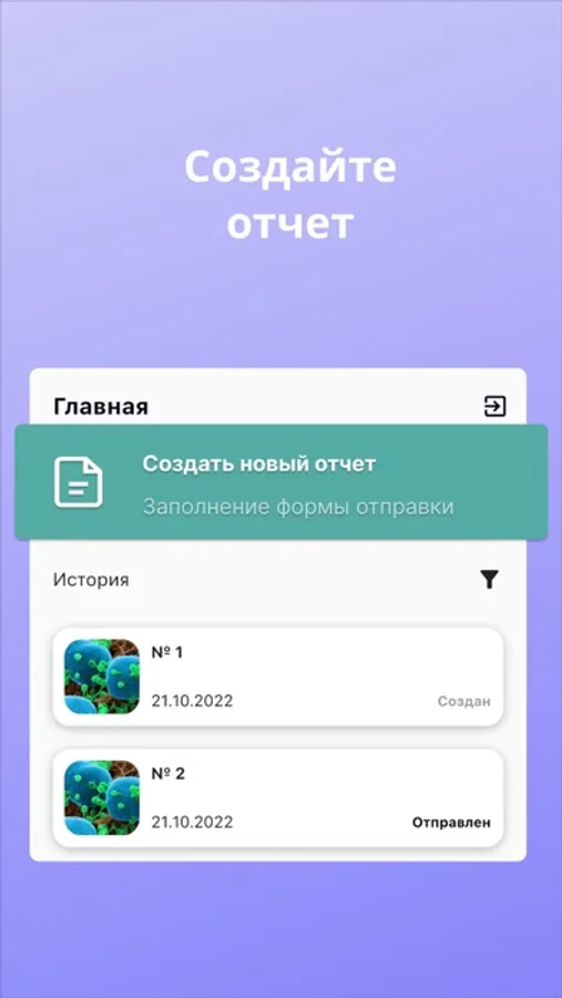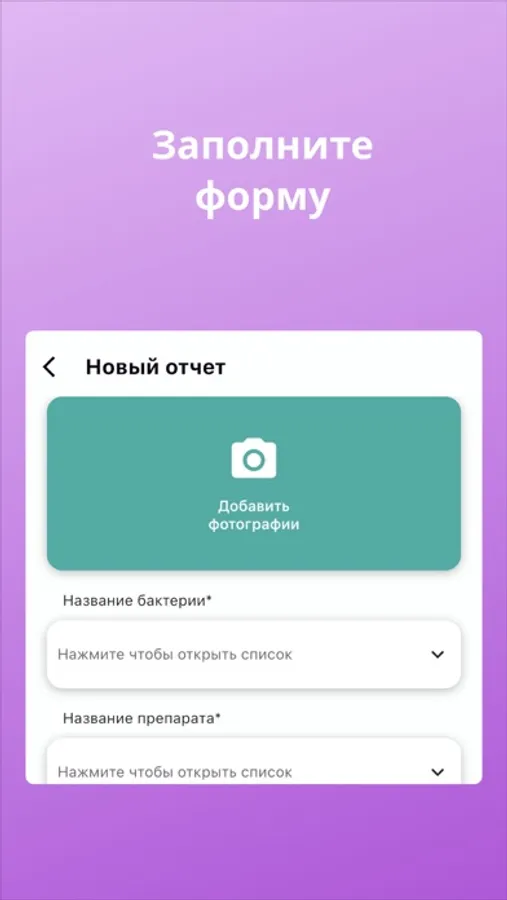 Приложение легко и просто позволяет создать отчет об исследовании, добавить фотографию чашки Петри и получить обратную связь от микробиологов.