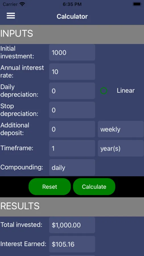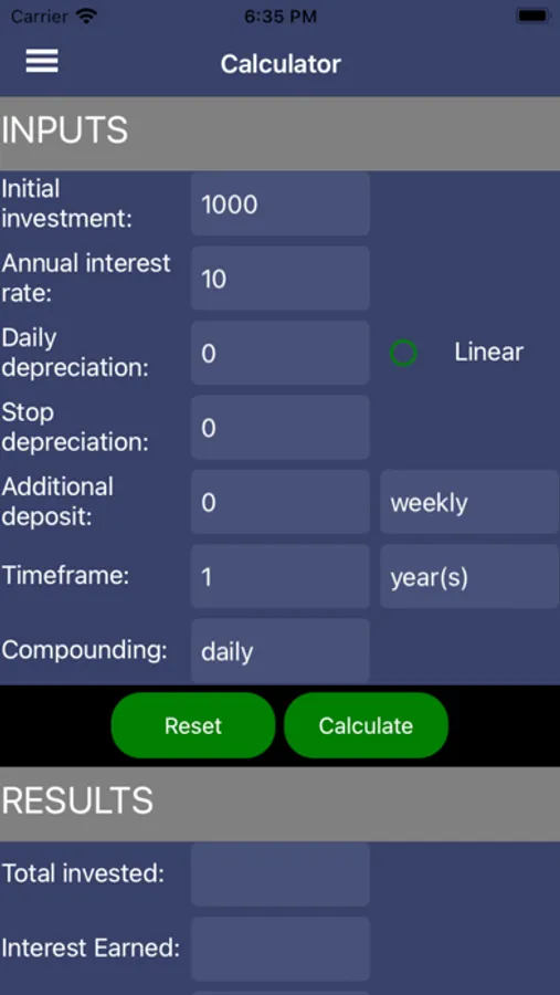 *Results include total invested, total interest earned, total value, and percentage gained after timeframe