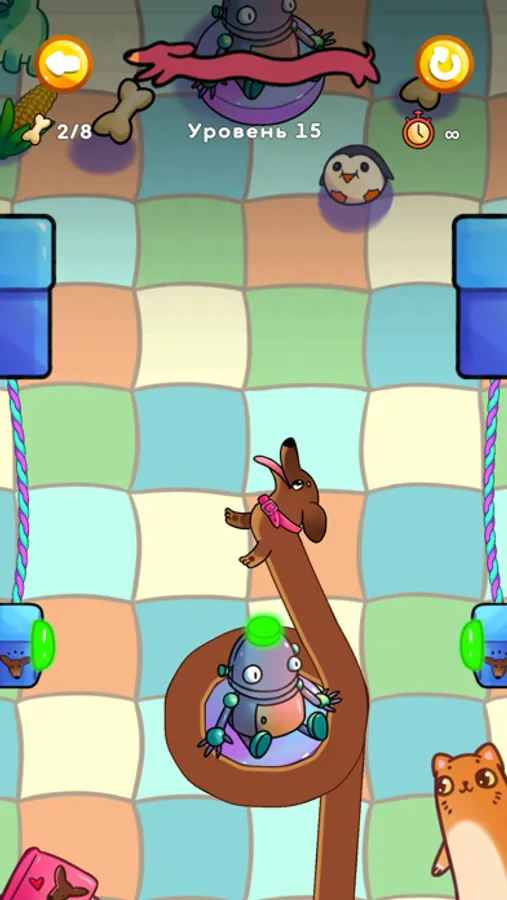 Chapitosiki is a casual puzzle game. You have to use the touch of your fingers to guide Tosya and Chapa through various obstacles to the finish line. In order for the dogs to reach the finish line, you need to collect various treats, but be careful, Tosya and Chapa do not like spoiled food, and also avoid dangerous objects that can harm them.
