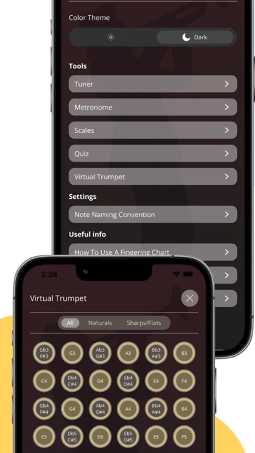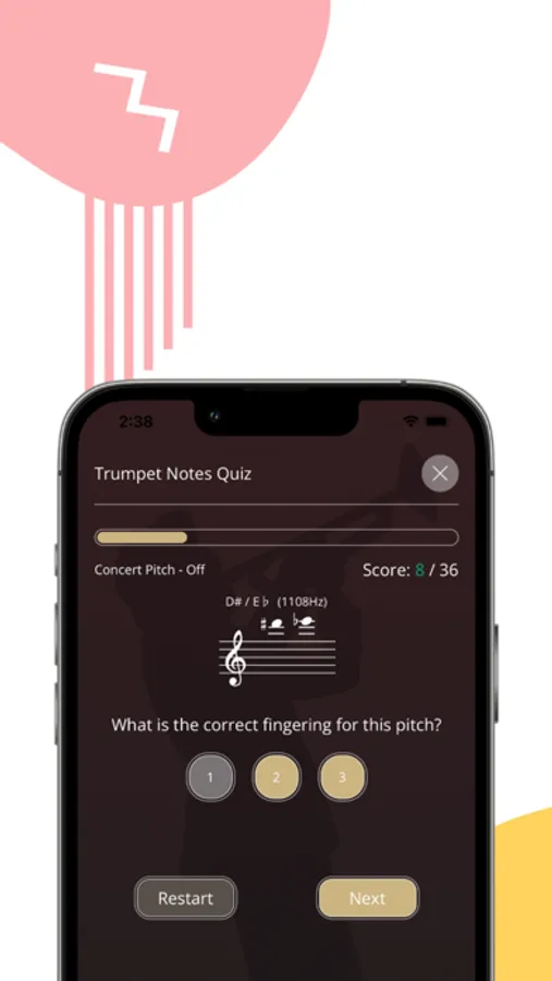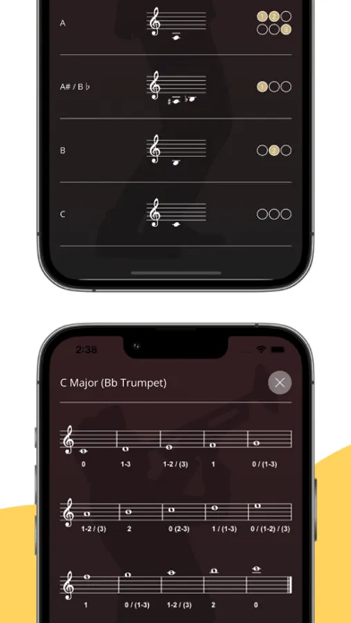 To help users get started, an onboarding guide is provided that explains how to use the trumpet fingering chart. Additionally, users can study trumpet notes through a quiz.