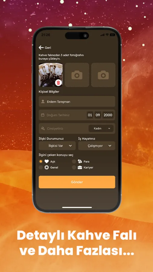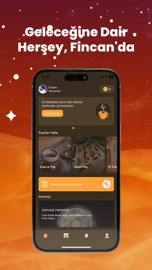 Yıldızların ve gezegenlerin, kısaca gökyüzünün gizemli dünyası da Fincan’da yer almaktadır. Doğum haritasından burçlara, yıldıznameden çeşitli kehanetlere kadar astrolojinin pek çok konusu bu uygulamada yer almaktadır. Hayata ve kendinize yönelik tüm sorularınız için Fincan’da yer alan astroloji hizmetinden faydalanabilirsiniz.