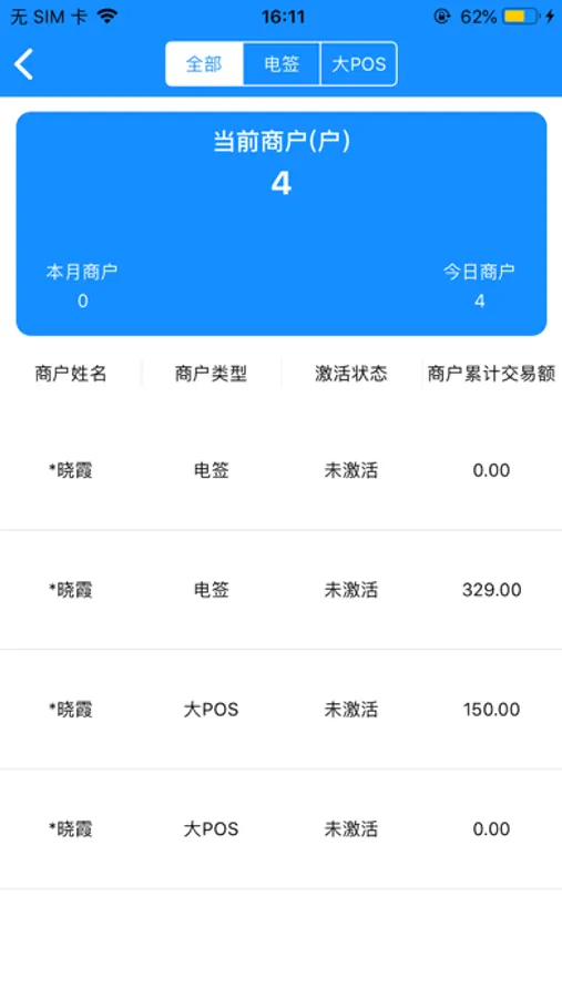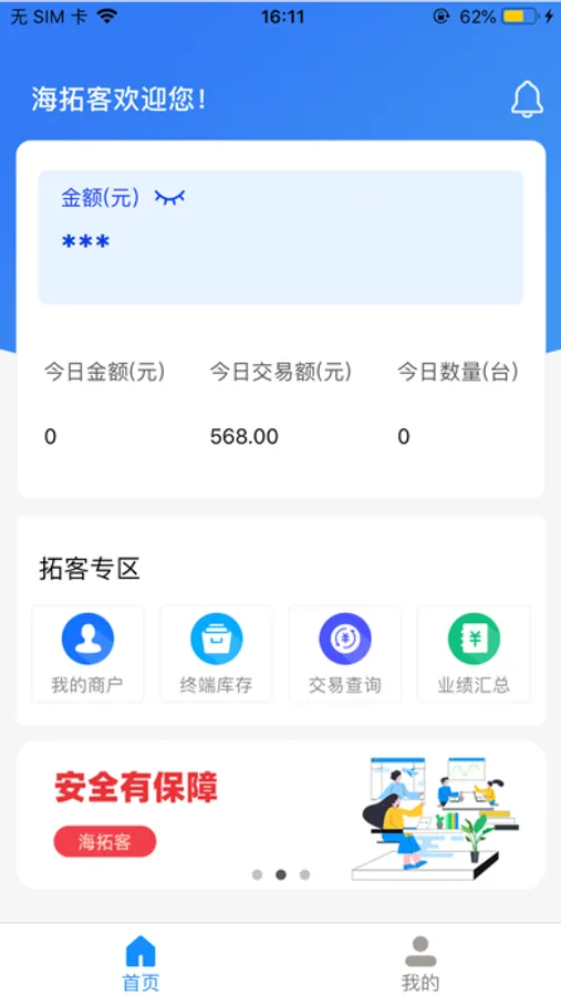 主要模块: 我的商户 终端库存 交易查询 业绩汇总 用户信息 更改密码 客服专线 版本信息 注销账户